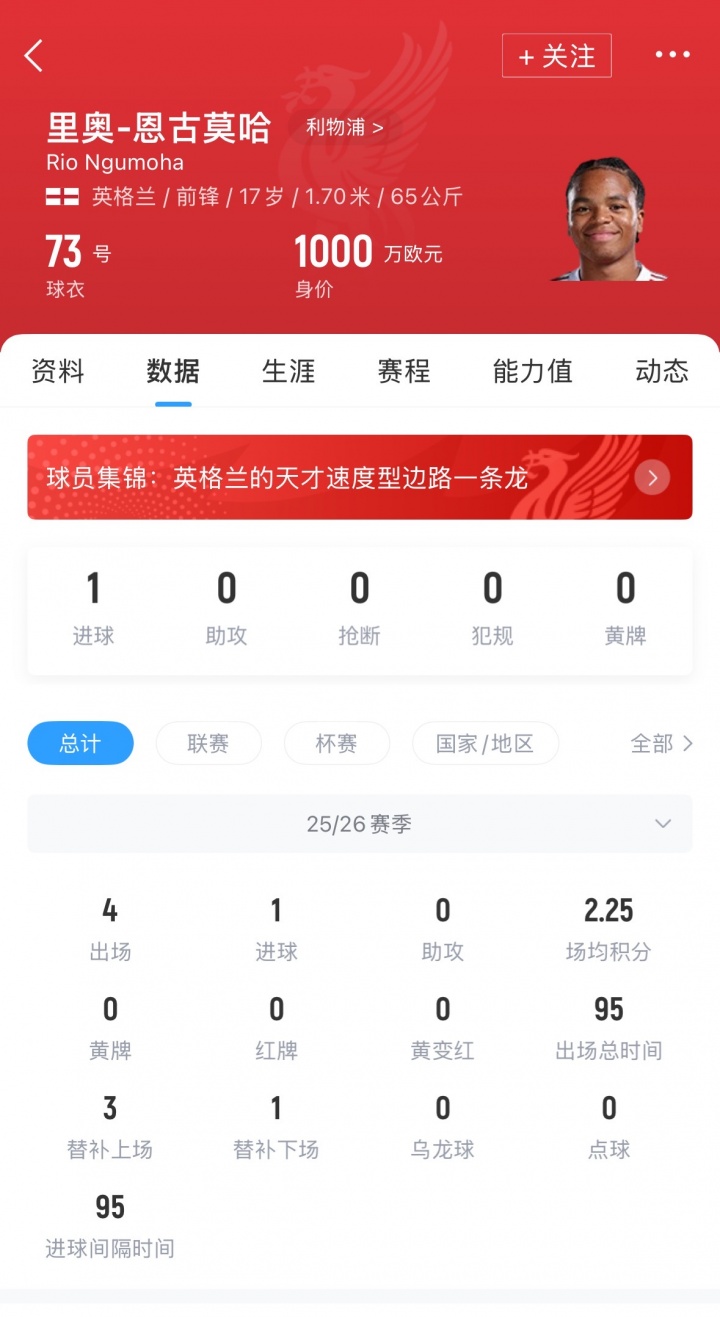 恩古莫哈本赛季出场4次,贡献1球,目前这位17岁的英格兰前锋德转身价为1000万欧元。