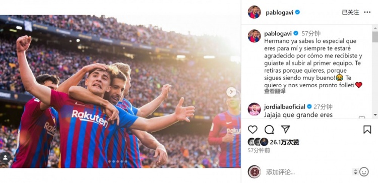 加维社媒晒出与阿尔巴的合照,并写道:“兄弟,你已经知道你对我来说有多么特别,在我升入一线队的时候,你的欢迎和引导让我永远心怀感激。”