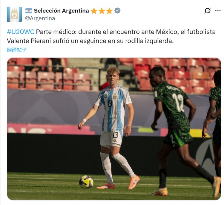 官方:阿根廷U20主力中卫皮埃拉尼左膝扭伤,此前连续4场首发