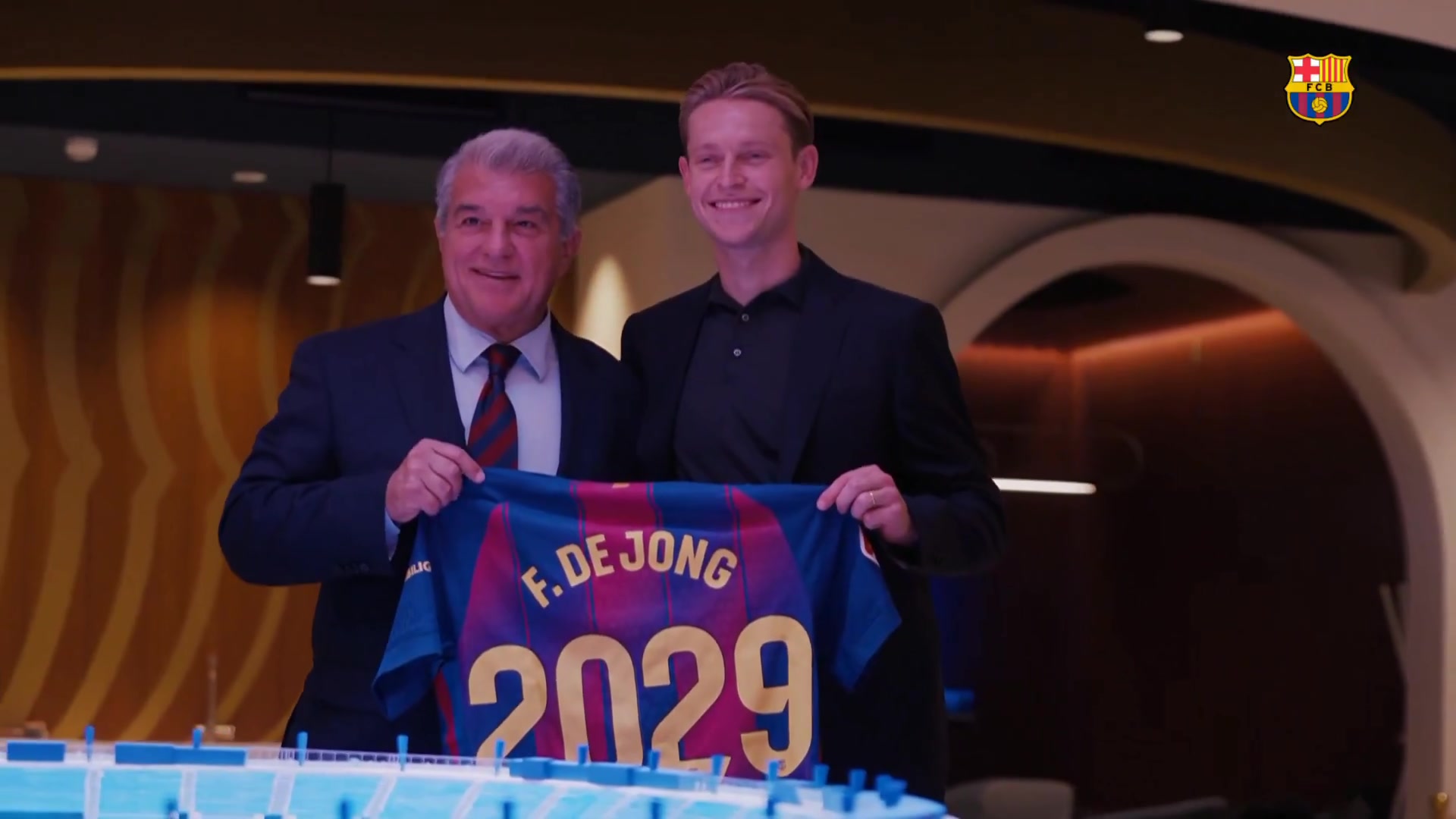 在续约完成后,巴萨在官方社交媒体上晒出拉波尔塔与德容展示球衣的视频,纪念德容续约成功,球衣上有2029字样。