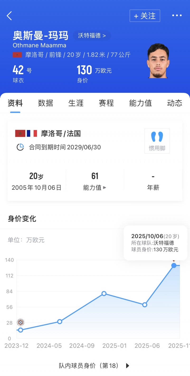 奥斯曼-玛玛目前身价130万欧。2024年晋升至蒙彼利埃一线队,参加14场比赛,打进2球并有1次助攻。今年夏窗,沃特福德以130万欧的价格签下了他,但球员尚未在英冠获得出场机会。