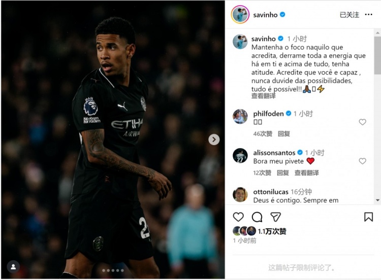 萨维尼奥社媒晒出比赛照片,并写道:“专注于你所坚信之事,倾注所有的能量,最重要的是,保持积极的态度。相信自己有能力做到,永远不要怀疑可能性,一切皆有可能!”