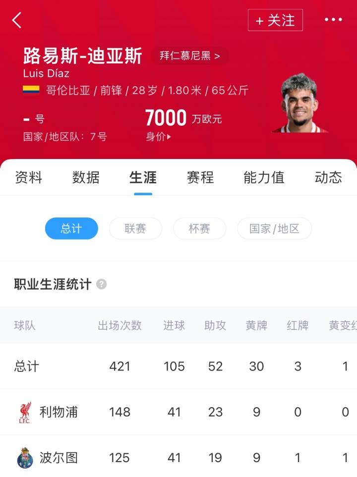 迪亚斯自2022年1月加盟利物浦以来,共出场148次,贡献41球23助,目前其德转身价为7000万欧。