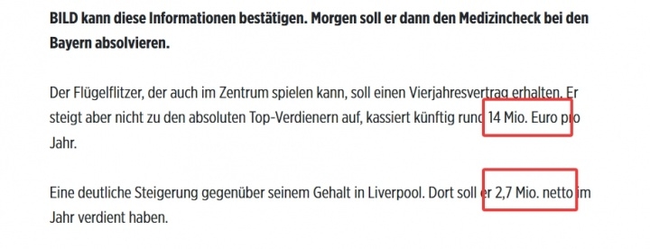 报道称,迪亚斯在拜仁的年薪预计为税前1400万欧元,相较其在利物浦时期的净年薪(约270万欧)实现显著增长。