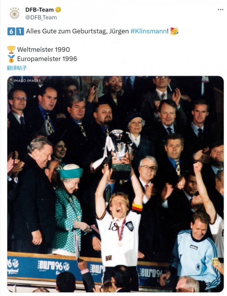 德国队社媒克林斯曼捧杯的照片,配文:“祝克林斯曼61岁生日快乐,1990年世界杯冠军、1996年欧洲杯冠军!”