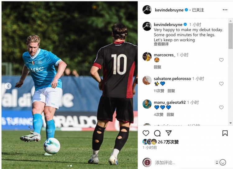 德布劳内社媒:很鼎沸今天献技首秀,比赛有助于复原情景
