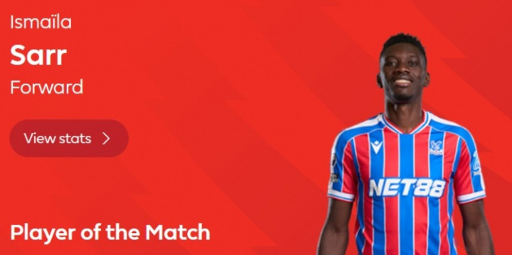 连进两球, 英超官方: 萨尔当选水晶宫3-1热刺全场最佳球员