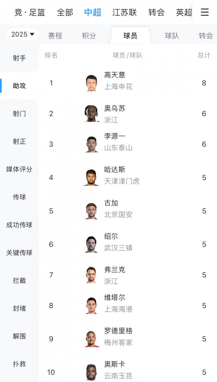 在本轮孝敬1传1射后,集结5轮联赛送助攻的申花中场高天意的助攻数来到8个,连续领跑助攻榜,奥乌苏、李源一则以6次助攻比肩排在第二位。