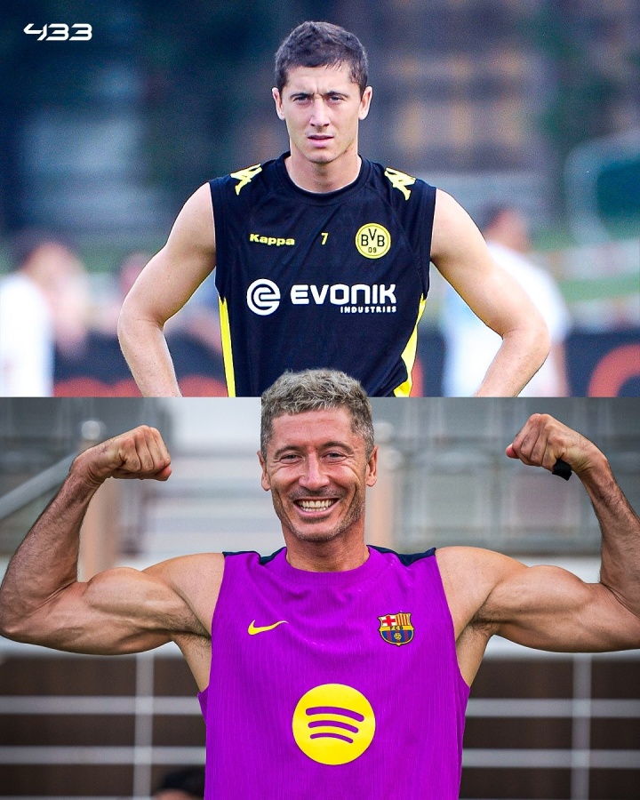 08月04日讯 外媒433晒出图片,对比了巴萨时尚莱万年青时与现时的躯壳。