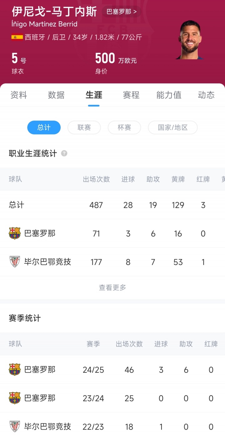 34岁的西班牙后卫伊尼戈-马丁内斯,2023年7月目田身加盟巴萨,两个赛季共代表巴萨出战71场比赛,打进3球并送出6次助攻。现在伊尼戈-马丁内斯的德回身价为500万欧元。