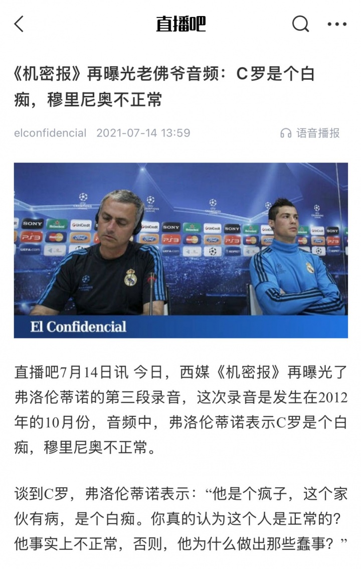 《高明报》于2021年接连曝光了多条弗洛伦蒂诺的通话灌音,其中的爆炸言论包括“C罗是个疯子”、“穆里尼奥不宽泛”、“卡西几乎是哈巴狗”、“劳尔、卡西是骗子”等等。