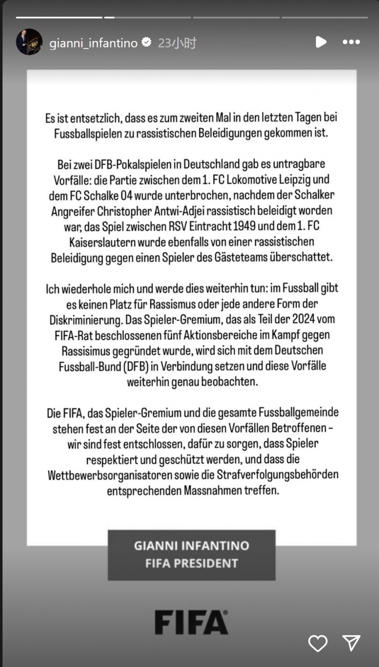 8月19日讯凯 海外足联主席因凡蒂诺更新社媒动态,对德国杯种族憎恶事件发声。