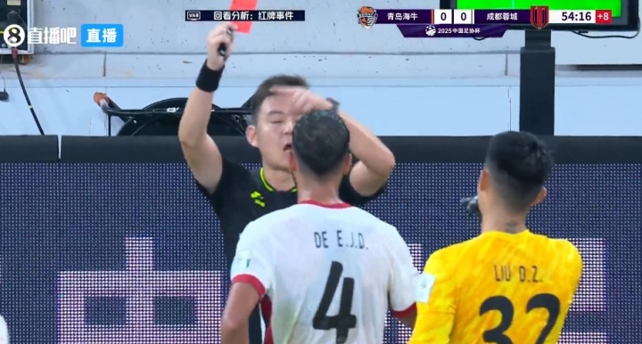 07月23日讯 今晚足协杯,青岛海牛vs成都蓉城,上半场补时临了阶段,德尔增多无球现象肘击孙正傲,裁判看VAR后出红牌!两边齐10东谈主应战!