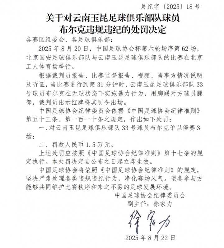 08月22日讯 当天足协官方公布布尔克红牌处分红果,云南玉昆球员布尔克在足协杯中对法比奥践诺暴力举止,对其停赛3场,罚金1.5万元。