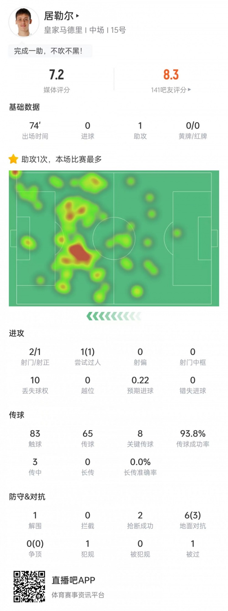 居勒尔本场数据:8次关节传球&送出助攻,传球告捷率93.8%