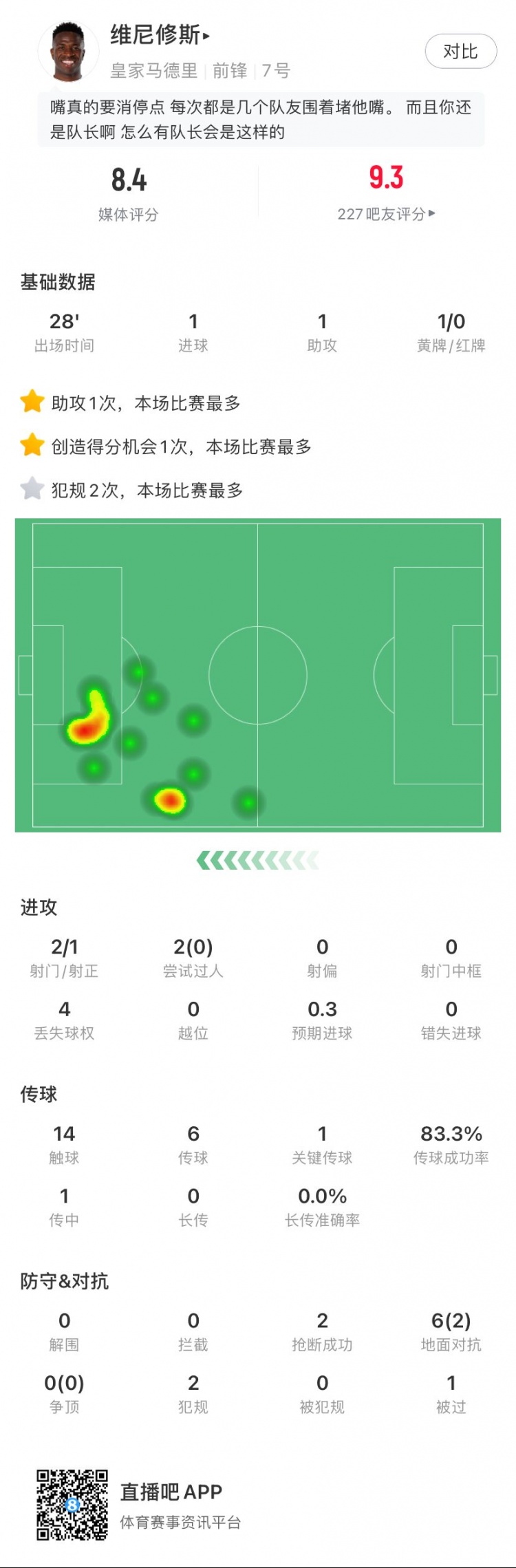 替补传射!维尼修斯全场数据:1进球1助攻,1次关节传球,评分8.4