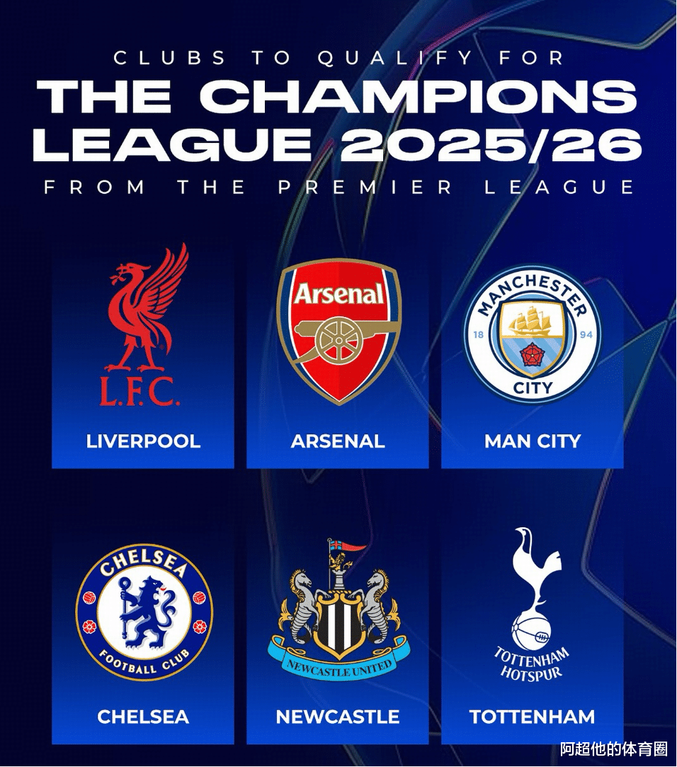 英格兰:利物浦、阿森纳、曼城、切尔西、纽卡斯尔、热刺(欧联杯冠军)