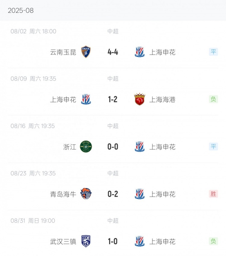 霎时掉链子!上海申花8月5场比赛1胜2平2负 仅得益5个积分