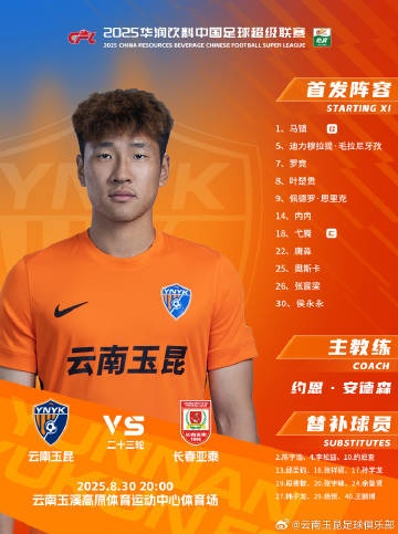 云南玉昆vs长春亚泰 本场比赛云南玉昆出场名单出炉