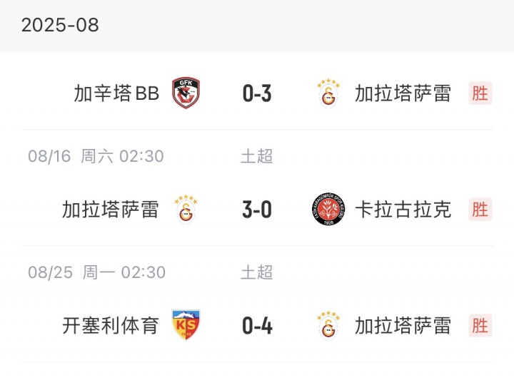 08月25日讯 土超第3轮,加拉塔萨雷4-0客胜开塞利体育,联赛开局三连胜,进10球+0丢球。