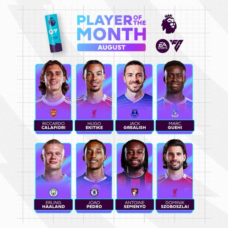 英超8月最好候选:格拉利什、格伊、哈兰德在列,利物浦两将入选