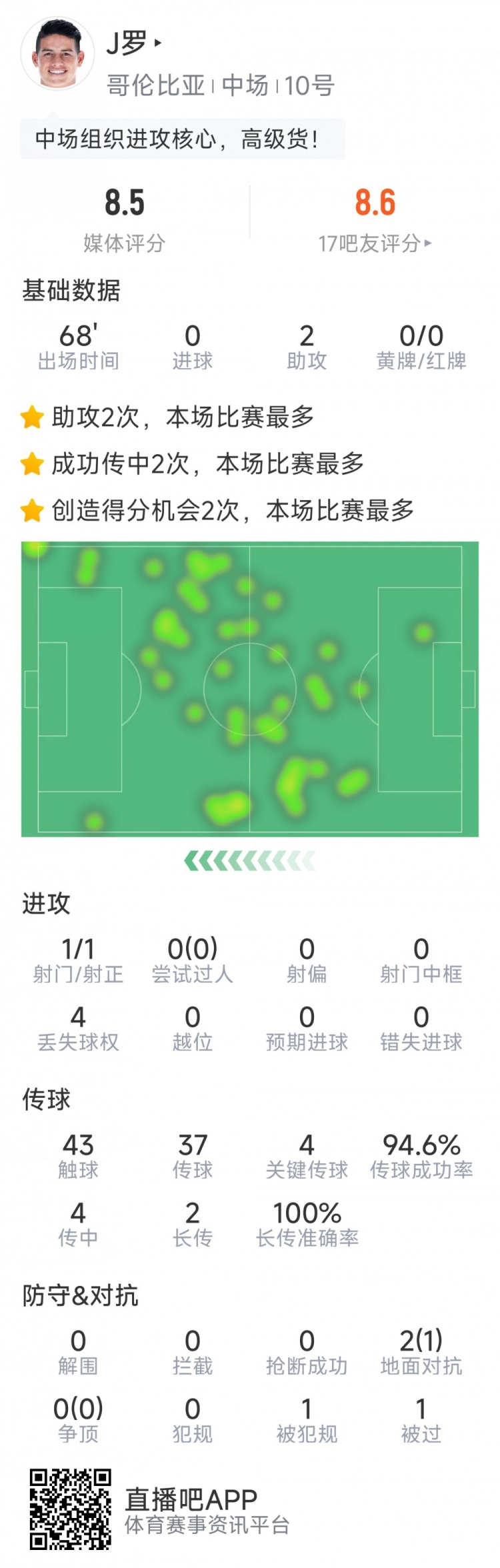 不行替代,J罗本场数据:助攻双响,4次要道传球,1次射正