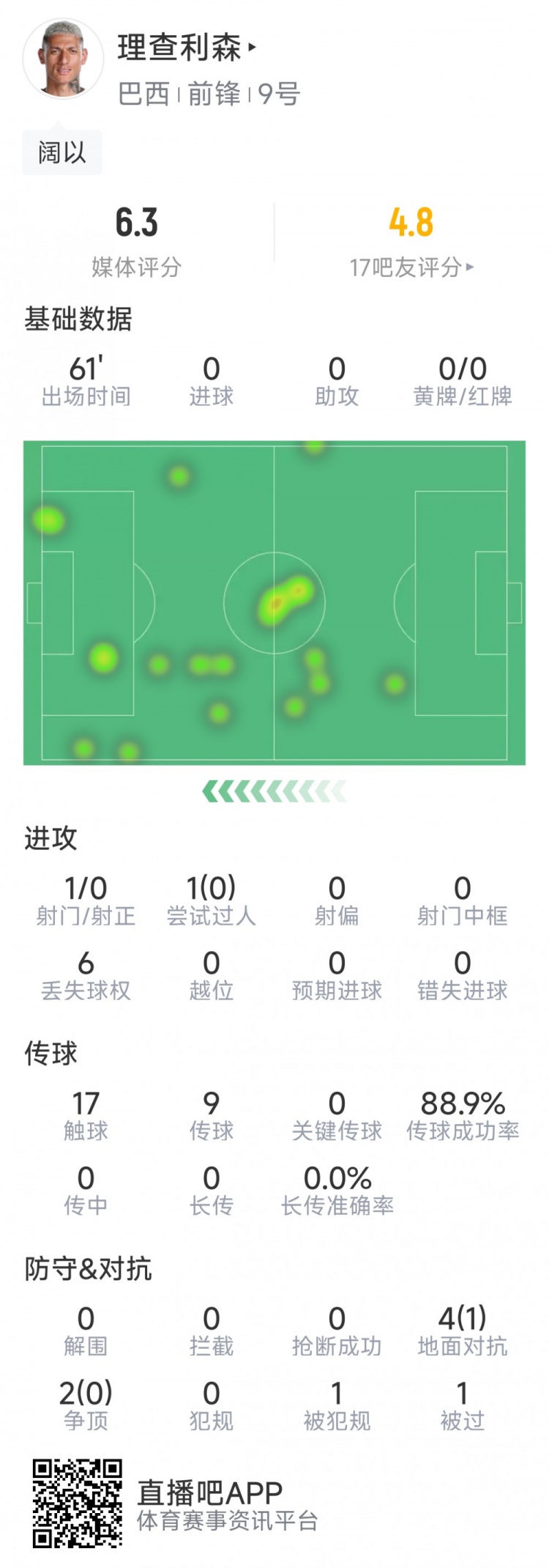 契机未几,理查利森本场数据:1射0正,6次反抗仅1次到手