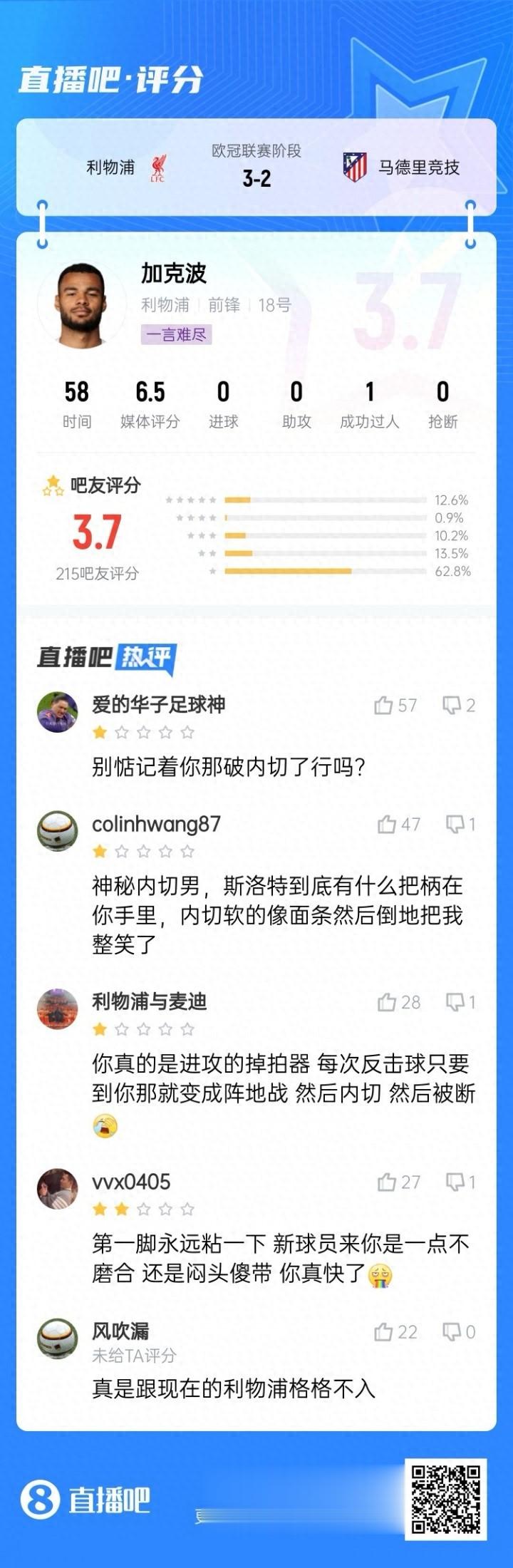 赛后吧友为加克波打出3.7的低分,月旦加克波:首要掉拍器 别再记念那破内切了