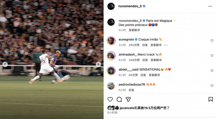 🪄努诺-门德斯发文说念打败巴萨:魔法般的巴黎,难得的分数