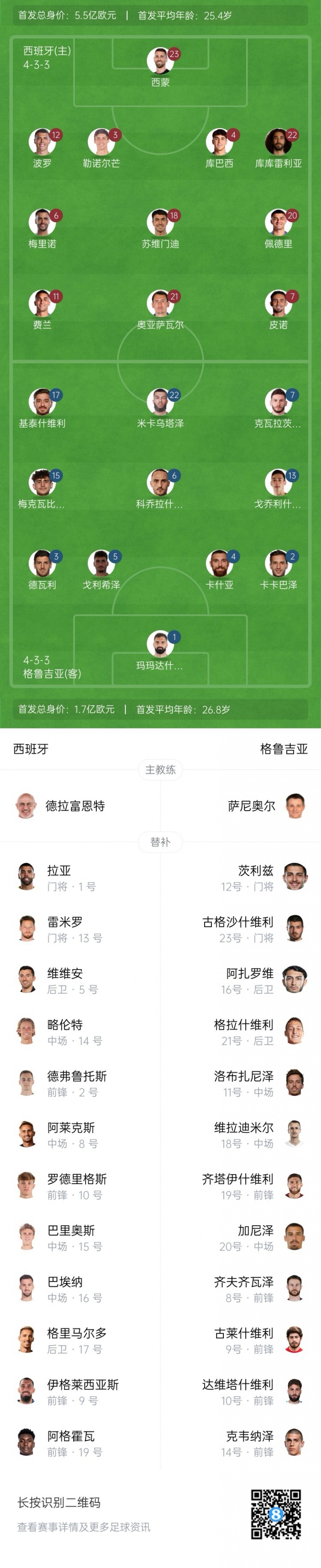 西班牙vs格鲁吉亚首发:佩德里、费兰、梅里诺先发,K77出战