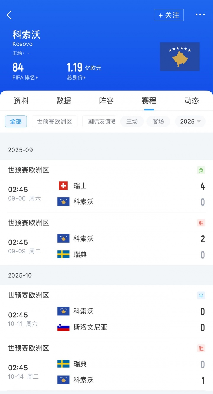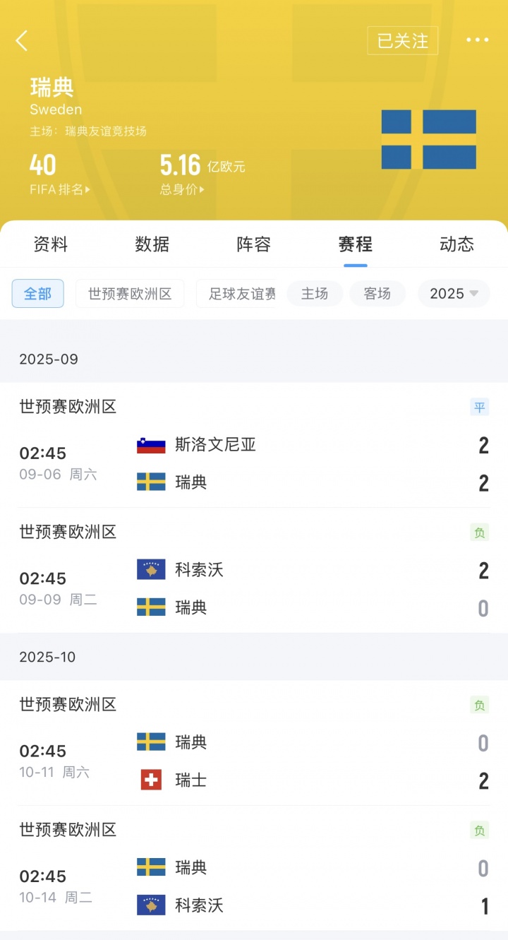 9月世初赛,瑞典2-2斯洛文尼亚、0-2科索沃,排行从宇宙第29跌至第32;10月世初赛,瑞典0-2瑞士、0-1科索沃,排行又从宇宙第32跌至第40。当今,瑞典活着欧预B组排行垫底。