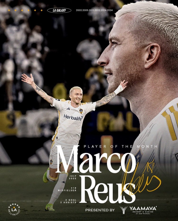 5场2球2助!罗伊斯当选洛杉矶星河7月最好球员,衔接3个月当选