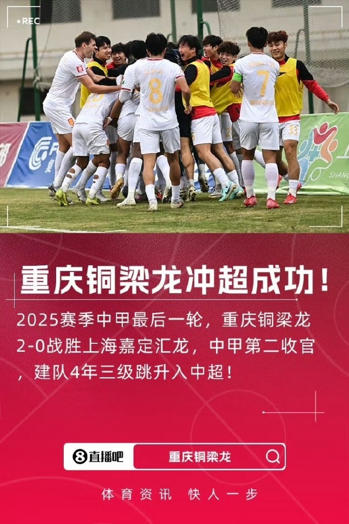 11月8日讯 中甲赛季收官战放手,重庆铜梁龙2-0礼服上海嘉定汇龙,最终名次积分榜第二,冲超胜利。
