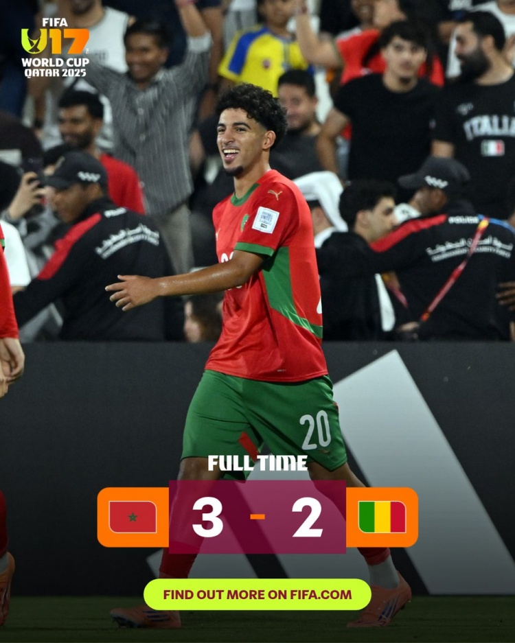 摩洛哥U17球员Ismail El Aoud而后连进两球,将场上比分改写为3-1,马里U17球员Tièmoko Berthe不才半场补时阶段打进1球,场上比分最终定格为3-2。