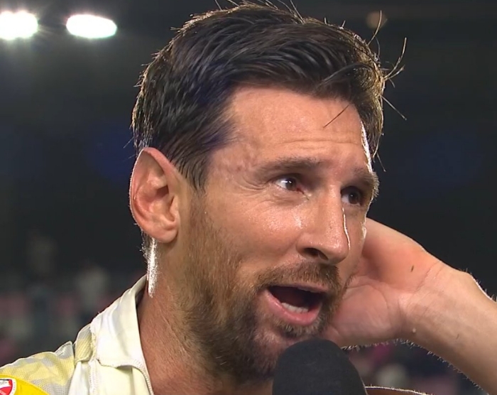 07月31日讯 定约杯小组赛,梅西助攻双响,迈阿密海外2-1阿特拉斯。赛后梅西摄取采访。