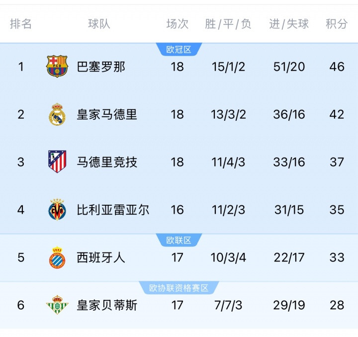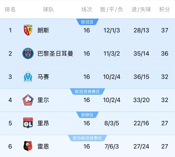 西甲前二巴萨、皇马差4分;法甲前二朗斯、巴黎差1分。