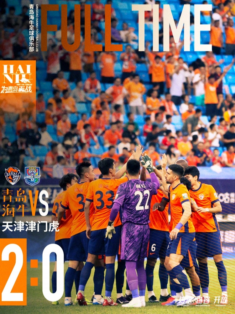 青岛海牛主场2:0驯顺天津津门虎!还没到庆祝本领,惟有链接接触!