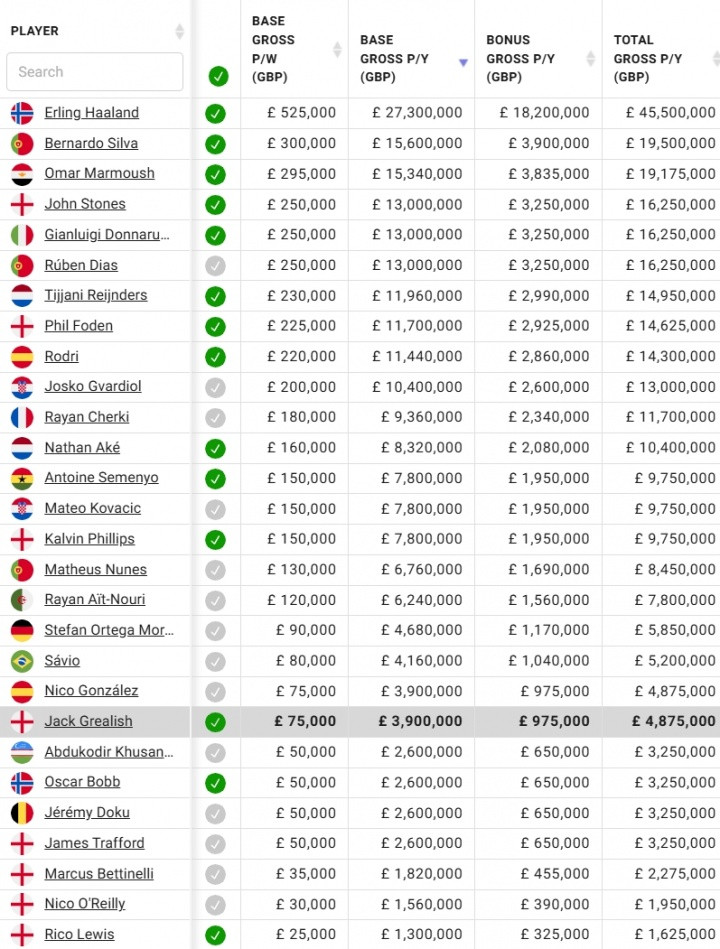 曼城球员薪资: 哈兰德居首, 塞梅尼奥15万镑第13, 多库5万镑第23