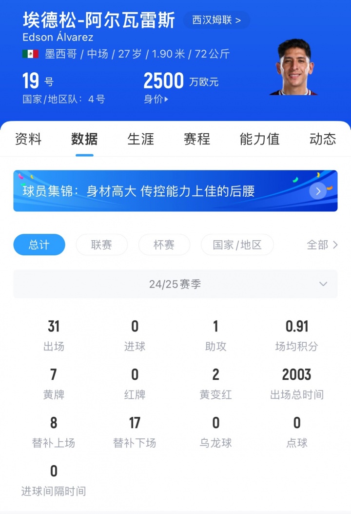 埃德松-阿尔瓦雷斯现年27岁,司职真贵型中场,上赛季出战31场比赛,送出1记助攻,德回身价2500万欧元。