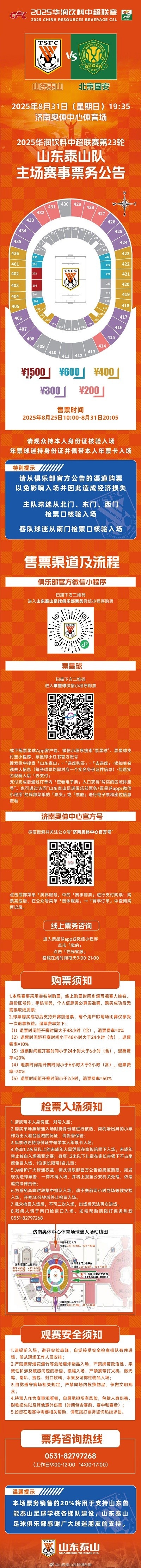 2025华润饮料中超联赛第23轮山东泰山队主场赛事票务公告