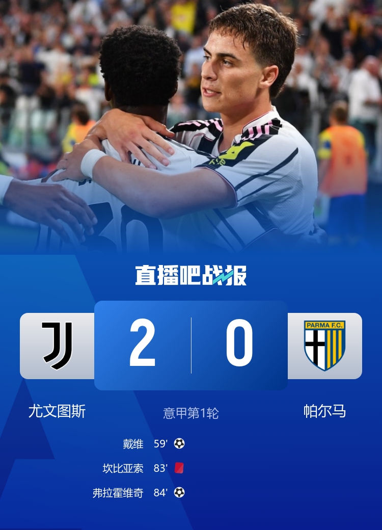 戴维成绩尤文正赛首球,弗拉霍维奇替补破门,坎比亚索抨击看成染红。最终十东说念主尤文主场2-0礼服帕尔马。