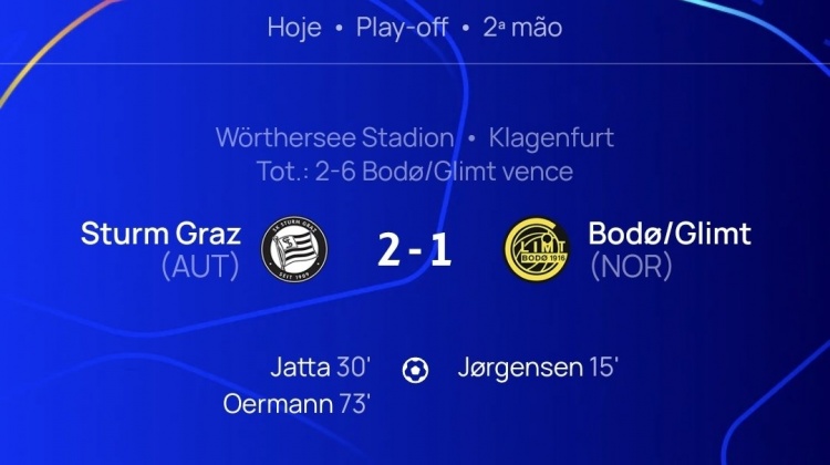 尽管次回合1-2输球,但博德耀眼总比分6-2淘汰格拉茨风暴,获取欧冠正赛阅历。