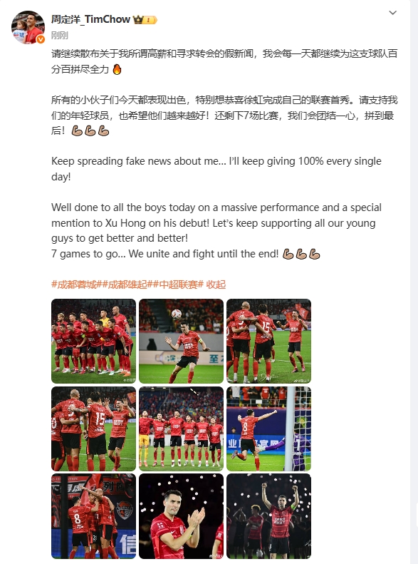 统统的小伙子们今天齐泄漏出色,特别念念恭喜徐虹完成我方的联赛首秀。请救助咱们的年青球员,也但愿他们越来越好!还剩下7场比赛,咱们会合作一心,拼到终末!💪🏼💪🏼💪🏼”