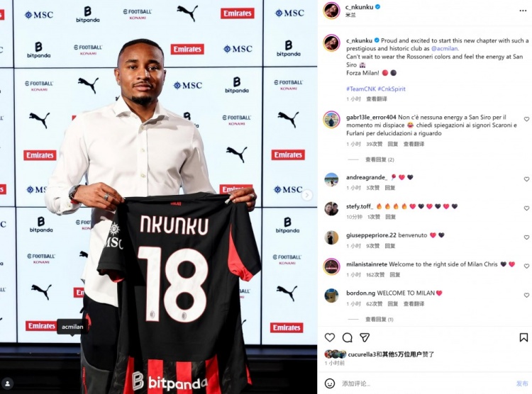 恩昆库在社媒配文写谈:“格外运气且抖擞好像与如斯享有殊荣和历史悠久的俱乐部开启新篇章。迫不足待念念要穿上红黑战袍,在圣西罗球场感受到那份心扉。米兰加油!”