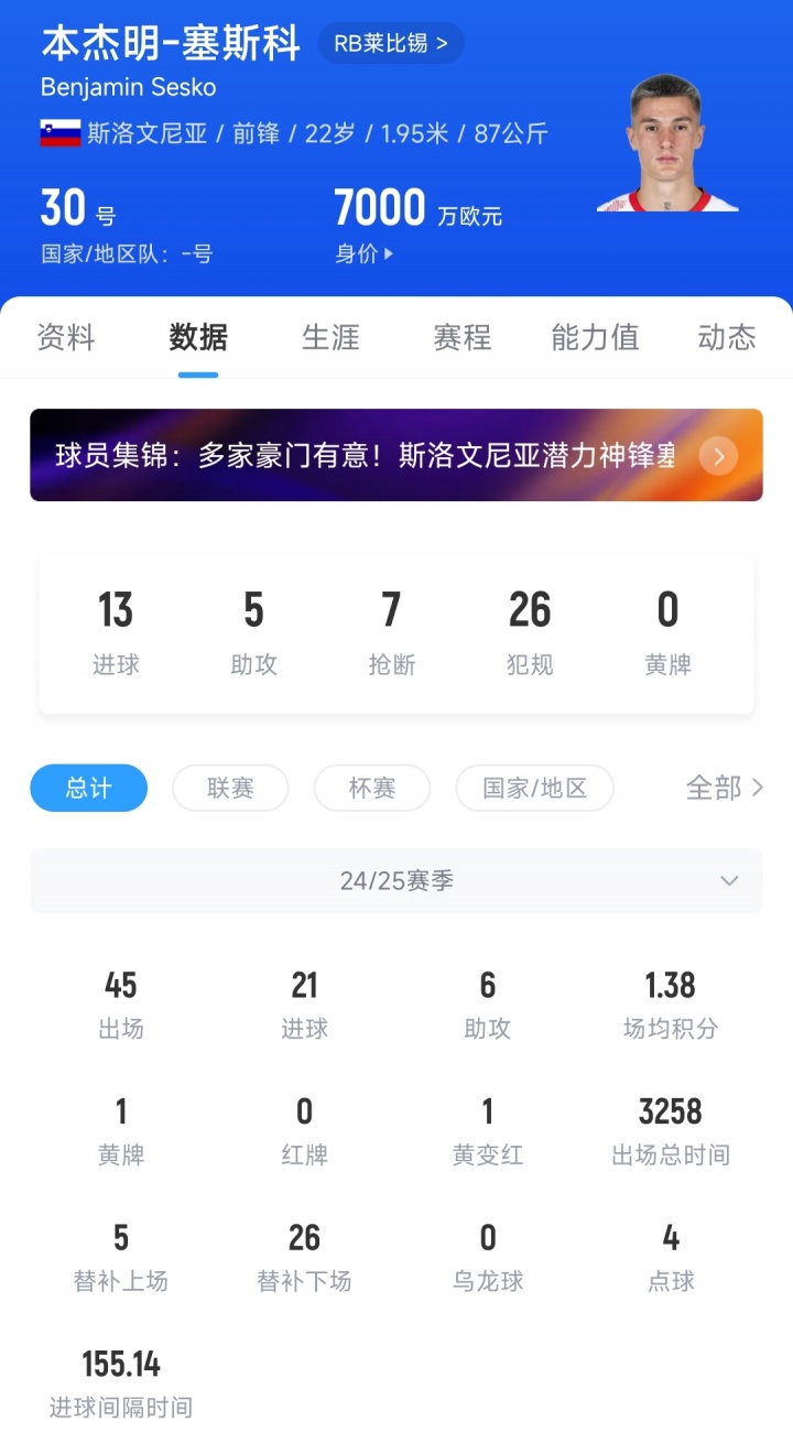 上赛季塞斯科代表莱比锡出战45场比赛,孝敬21粒进球和6次助攻,西蒙斯则是33场11球7助,现在两东说念主的德回身价王人是7000万欧元。