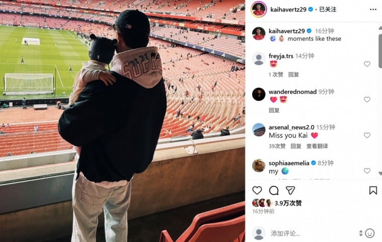 见证大捷,哈弗茨社媒晒抱着孩子现场看球相片:就像这么的本事!