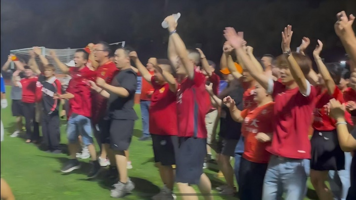 一侧球门后站着几十位穿红色穿戴的东说念主,一部分是恒大足校球员家长,另一部分是广州队球迷“残部”。这些东说念主来自广州、西安、上海、常州……他们还在坚合手用“广州队”三个字为孩子们加油,氛围有点凄迷——这个词可能不太精准,但也莫得更合乎的词了。