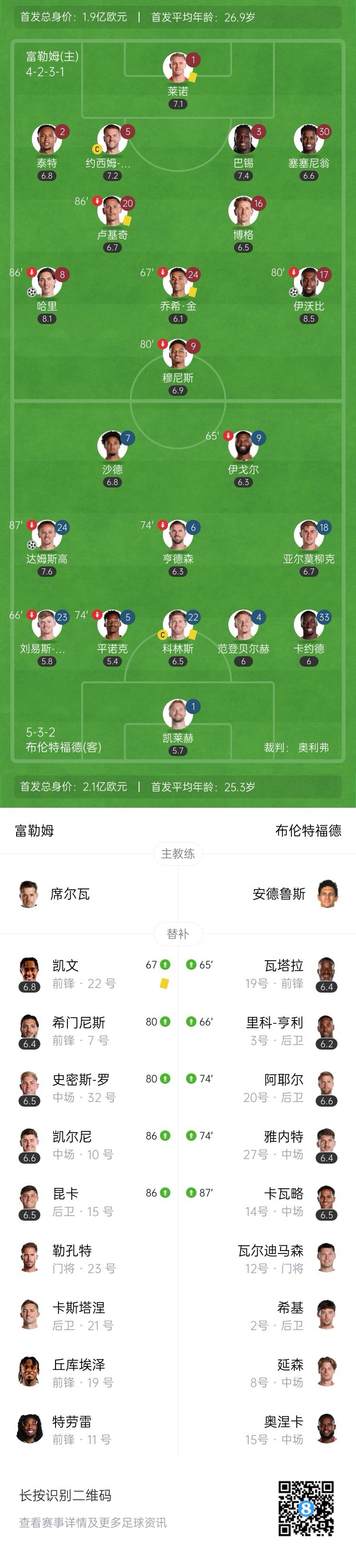 最终富勒姆3-1打败布伦特福德得益英超两连胜。