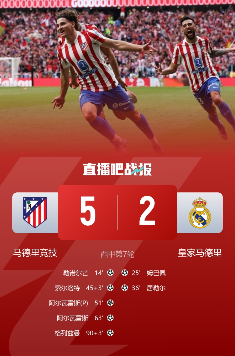 平均每东说念主少跑2km!德比战皇马球员平均跑动仅7.8km 马竞高达9.6km
