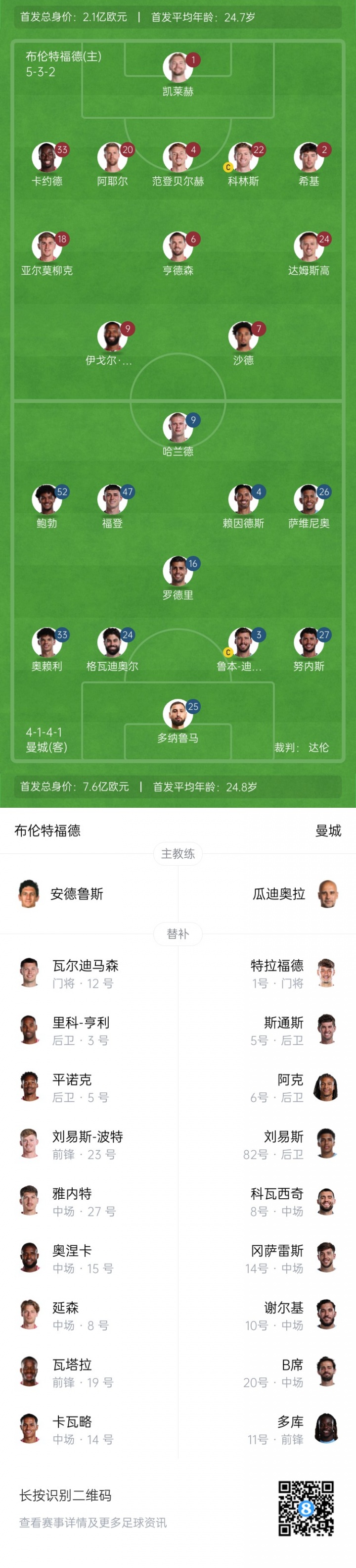10月05日讯 北京时代今晚23点30分,英超第7轮,曼城客场对阵布伦特福德,赛前两边公布首发声势。